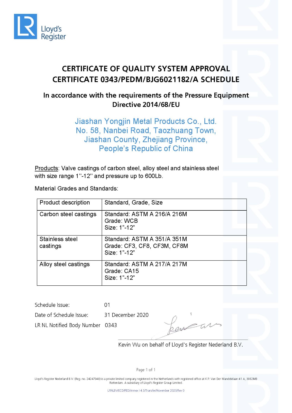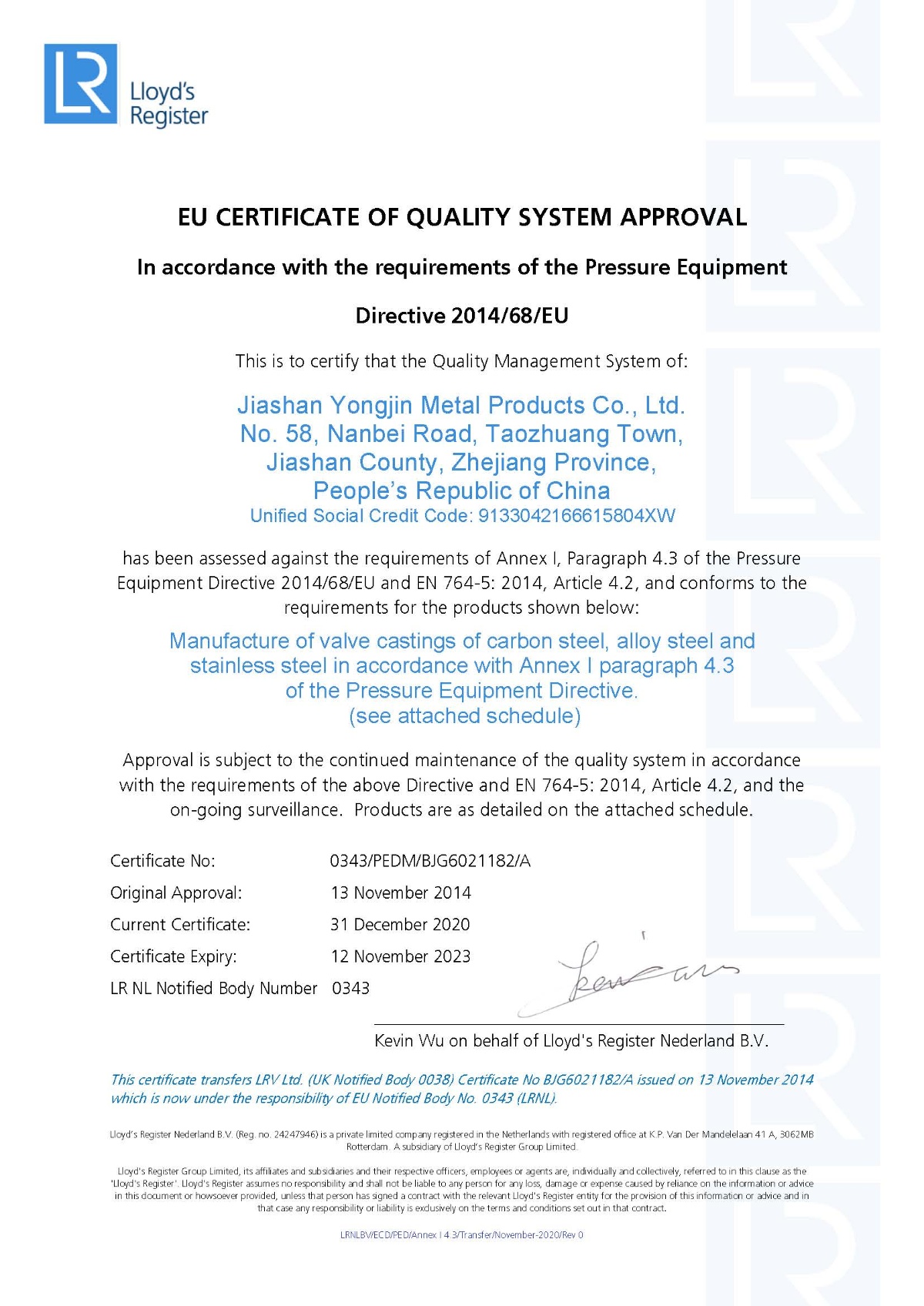 通過歐盟壓力容器指令PED 2014/68/EC Annex I - 4.3認(rèn)證